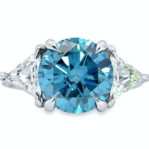 18K White Gold Setting: 2 Trillion Cut Diamonds 0.65 ct 16 Diamonds 0.31 ct Center: Blue Diamond 3.85 ct Style: GORR41BD