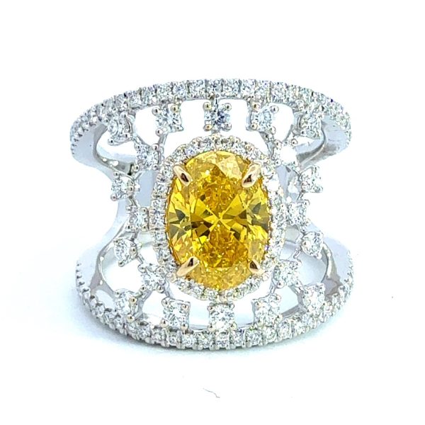 Setting: 18k Two-Toned Gold 14 Diamonds 0.50 carats Center: Yellow Diamond weighing 3.02 carats Style: GOR21