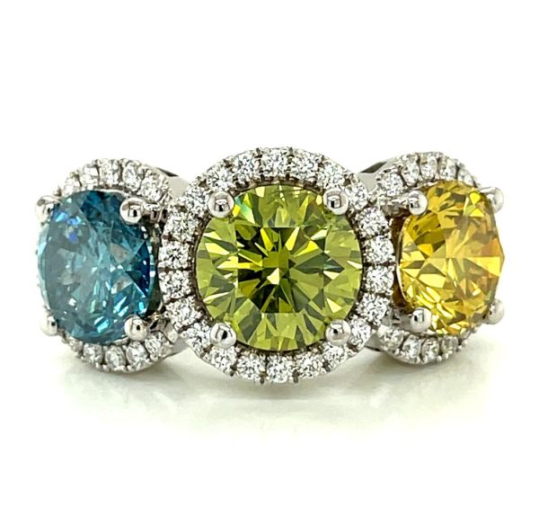 Centers: 3.40 carats (Blue Diamond), 3.09 carats (Green Diamond), 3.19 carats (Yellow Diamond)