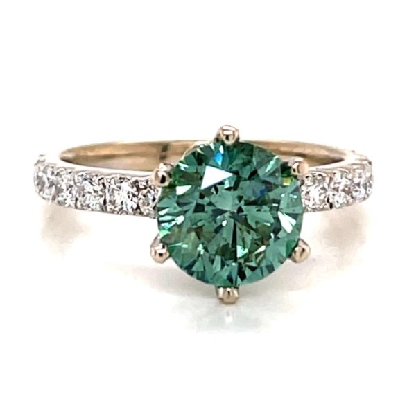 18k White Gold Setting: 61 Diamonds 1.06 carats Centers: 3.40 carats (Blue Diamond), 3.09 carats (Green Diamond), 3.19 carats (Yellow Diamond) Style: GOR18
